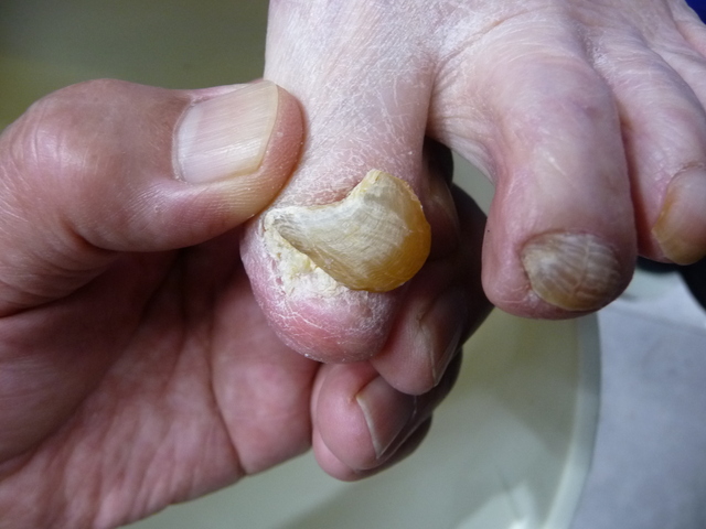 硬い水虫 2023/10/27 80歳後半の女性が来院しました 爪を1年以上切っていなかったらしく写真のような爪になりました 勿論、水虫の影響でこのように変形しているのです 通常の水虫は削っていくとぼろぼろと崩れ落ちるようにはがれていきますが今回の爪は中心までしっかり硬かったです セラミックの刃で削りました セラミックの刃が無かったらかなりの時間がかかったでしょう